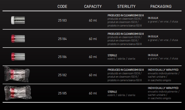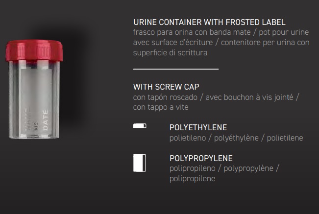 150 and 200 ml PP urine cups with screw cap. Non sterile cups have a blue screw cap and are sold in multi-packs. Sterile cups have a red screw cap and a satinized marking area and are individually wrapped.